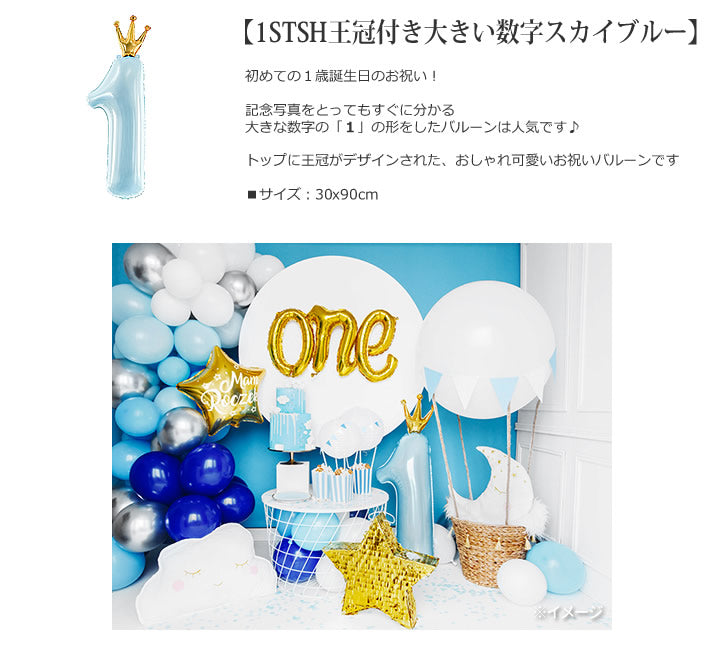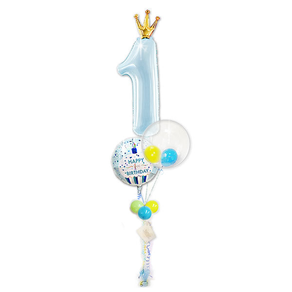 1歳誕生日におしゃれな透明バルーンセット - 男の子 1歳誕生日【王冠】大きい数字&インプチ3バルーンギフトセット<補充用ヘリウムガス付>