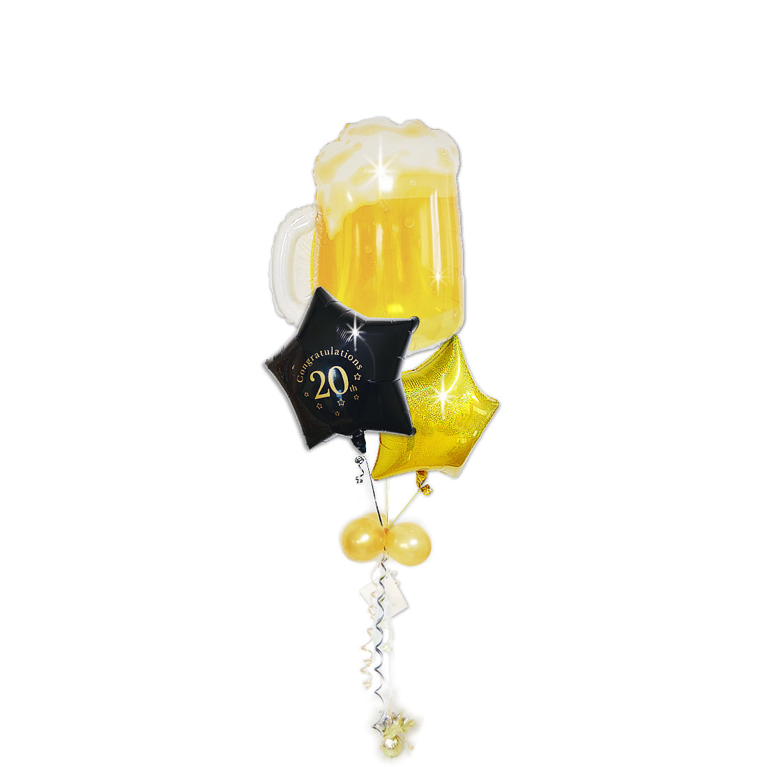 二十歳のお祝い 成人 祝い プレゼント 男性 彼氏 孫 息子 浮くバルーンでサプライズ - ビールで乾杯♪20thブラックスター ゴールドスター3バルーンギフトセット<補充用ヘリウムガス付>
