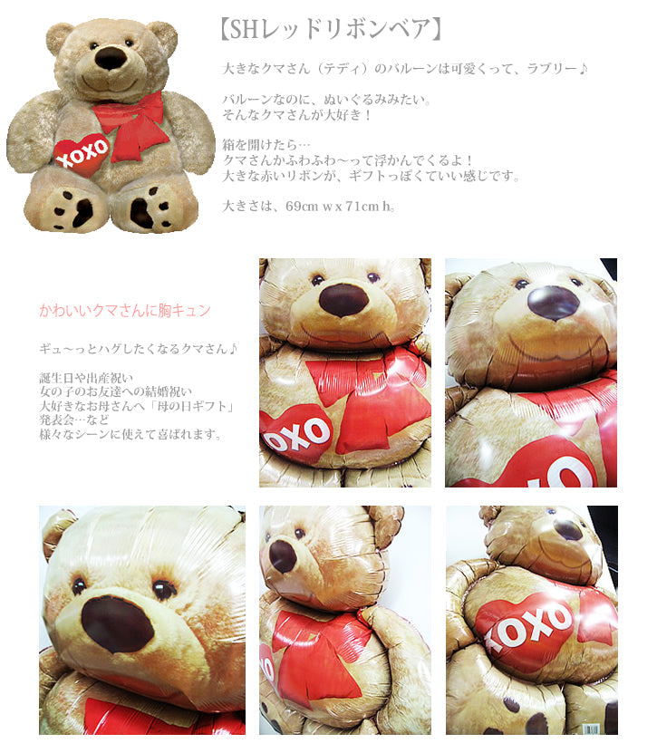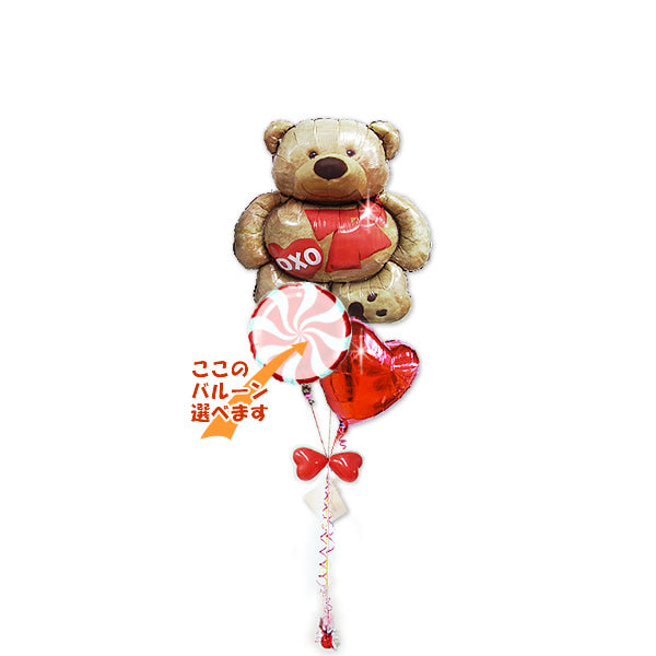 バルーン電報にかわいいクマ。女の子に人気! - レッドリボンベア&赤ハート3バルーンセット <補充用ヘリウムガス付>