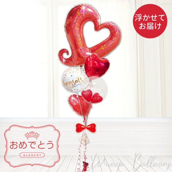 こちらは赤に振り切った、赤尽くしのお祝いをとことん追求したバルーンブーケ。メインには大胆で印象的な真っ赤なハートバルーンを使用しており、5個セットでしっかりとボリューム感のある仕上がりです。クルンと巻いたデコラティブなハートのフォルムがとにかくキュートで、さらに光に当たるとキラキラ輝く☆仕様。存在感・可愛さともにキラキラ度NO.1の主役級バルーンです。