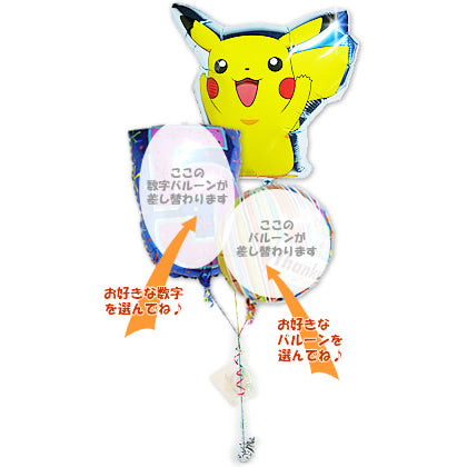 誕生日 七五三などのプレゼントにピカチュウ - 【数字入】ポケモン ピカチュウ卓上型3バルーンセット<補充用ヘリウムガス付>