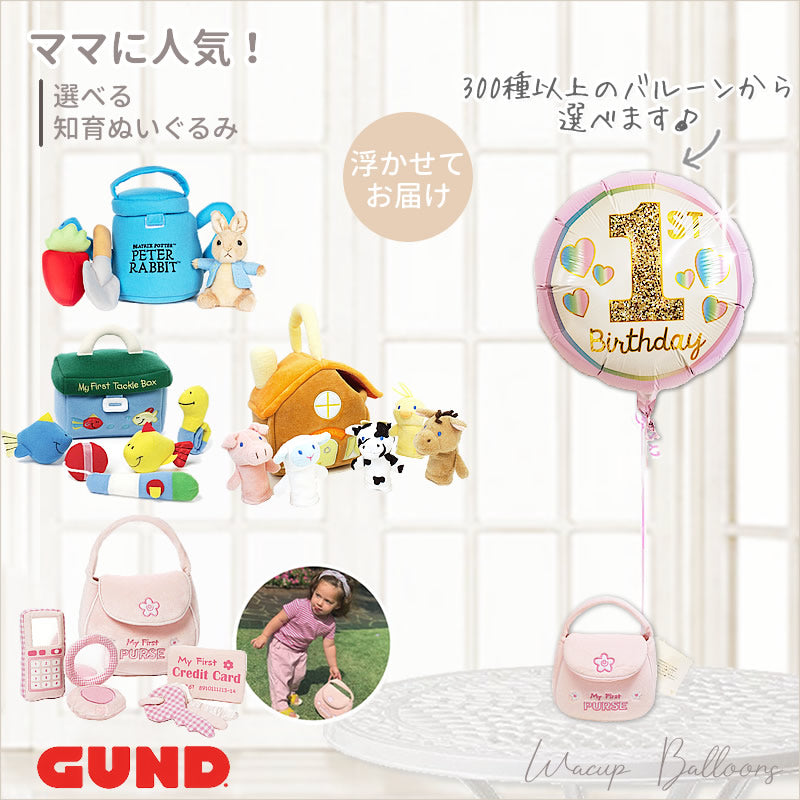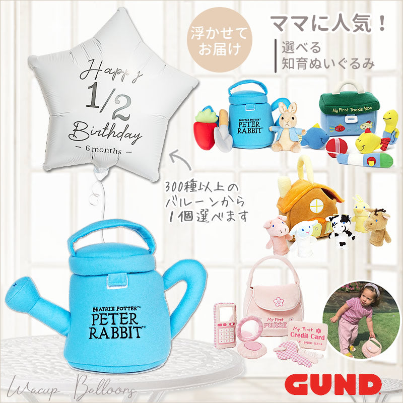 人気の知育おもちゃ 愛子様 おままごと セット ガンド 100日祝い お宮参り お食い初め 百日お祝い ハーフバースデー プレゼント 出産祝い 記念日 ピーターラビット - 選べるGUNDプレイセットのぬいぐるみが運ぶ♪ワンバルーンセット<補充用ヘリウムガス付>