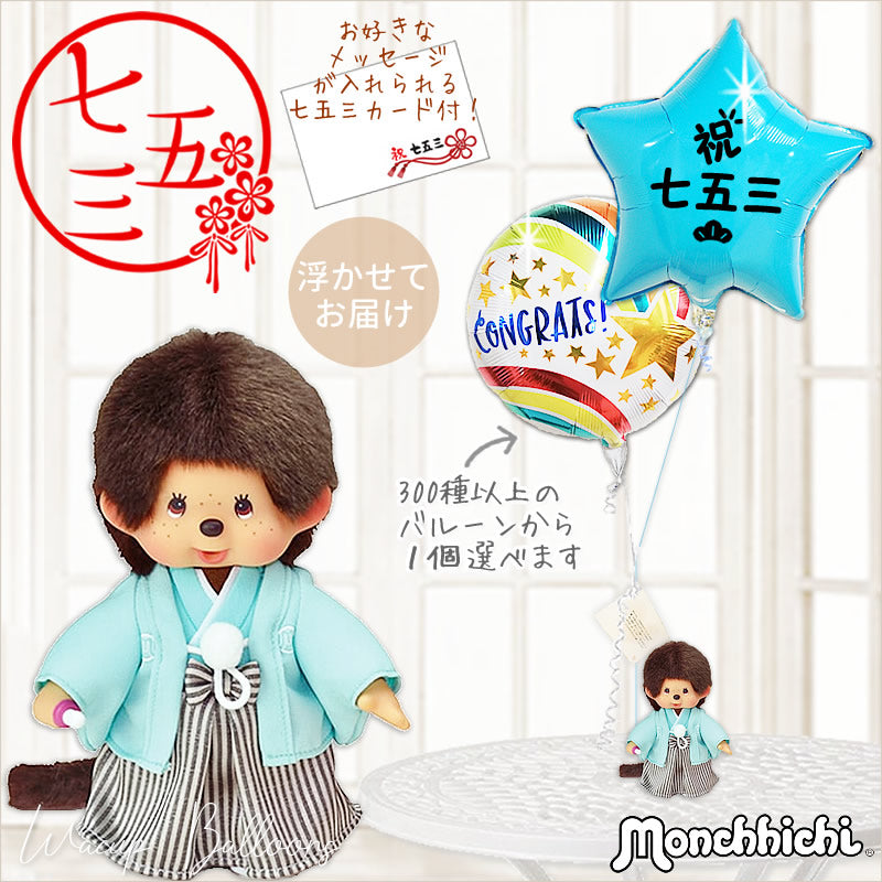 「祝七五三スターターコイズバルーン」1個(こちらのバルーンは固定)とお好きなバルーンが1個選べ、モンチッチ紋付袴S男の子と一緒にアレンジしてお届けします。