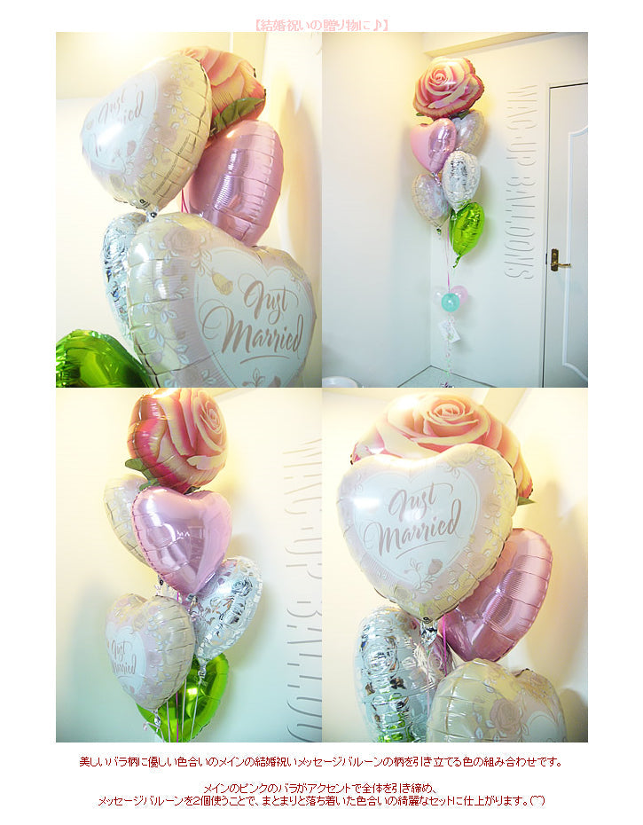 結婚祝いに美しいバラのバルーン6個セット - 結婚祝いピンクマリッド&ピンクローズ6バルーン電報セット<補充用ヘリウムガス付>