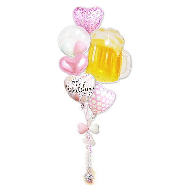 結婚式に大きなビールバルーン電報でお祝い - ビールで乾杯♪結婚祝いウィッシュサテンホワイト ピンクハート6バルーン電報セット<補充用ヘリウムガス付>