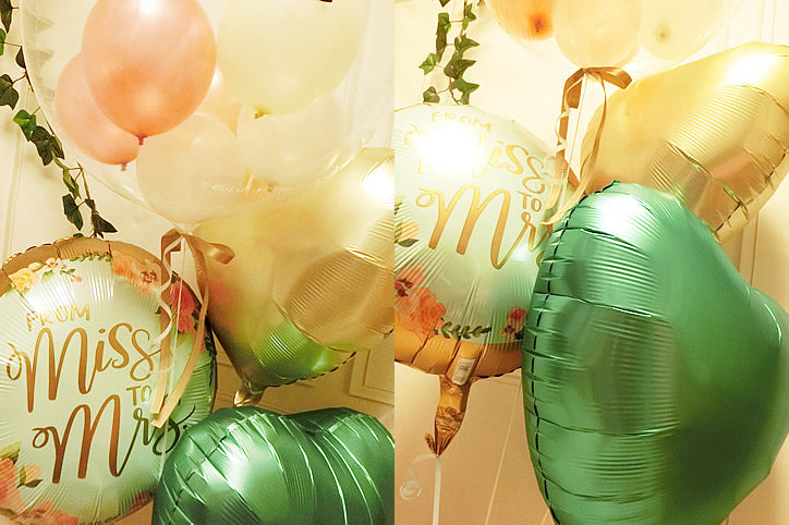 大人っぽさのある柔らかな色味のグリーン系ニュアンスカラーのバルーン電報なら結婚式場でセンスの良さが光ります。