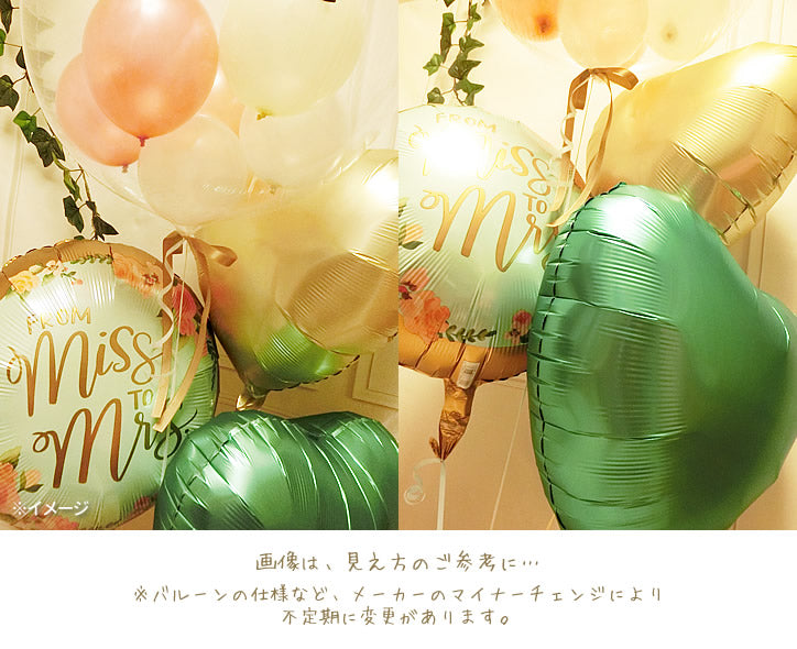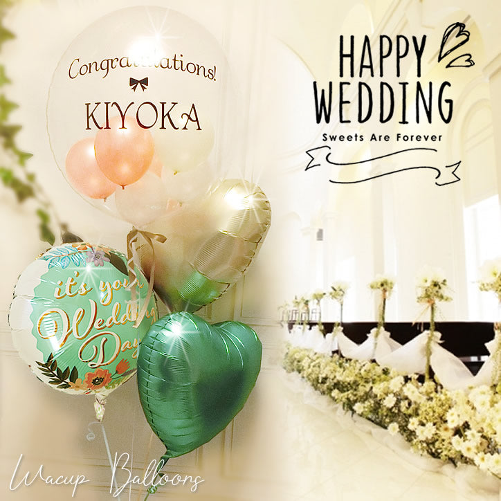 結婚式 名入れ ニュアンスカラー グリーン系 バルーン電報 - 透明バルーン プチエル【L】ローズゴールド名入れ付き 結婚祝ウェディングデーフラワー サテン4バルーン電報セット<補充用ヘリウムガス付>