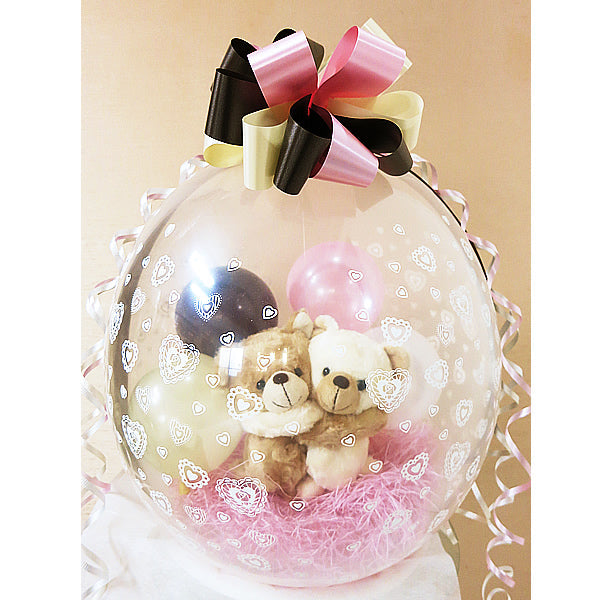 ぬいぐるみバルーン電報 クマのカップルを風船の中に入れた贈り物 くま ブタ カピバラ アザラシ 動物 - ぬいぐるみバルーンラッピングギフト:選べる めちゃラブ<ピンクブラウン>