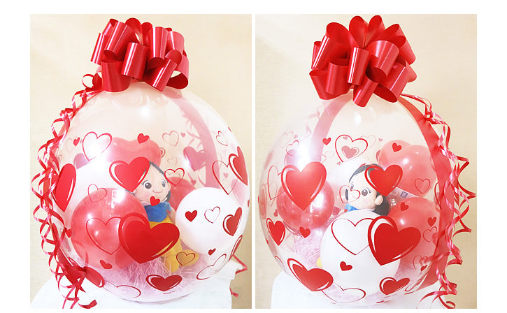 赤いハート柄のバルーンの中に、白雪姫のぬいぐるみが入ってます。 ハートのミニバルーンも一緒に入ってキュートな感じに仕上げました。 大きくてゴージャスなリボンが華やかさを添え、結婚式や誕生日、発表会などのプレゼントにぴったり♪ あまりの可愛さにインスタ映えするとツイッターなどSNSの口コミでも話題になってます。 卓上用なので、テーブル、玄関などの小スペースに飾れます。 箱を開けてびっくり!そして思わず「かわい?い!」の声が聞こえてきそう…♪ o(^-^)o
