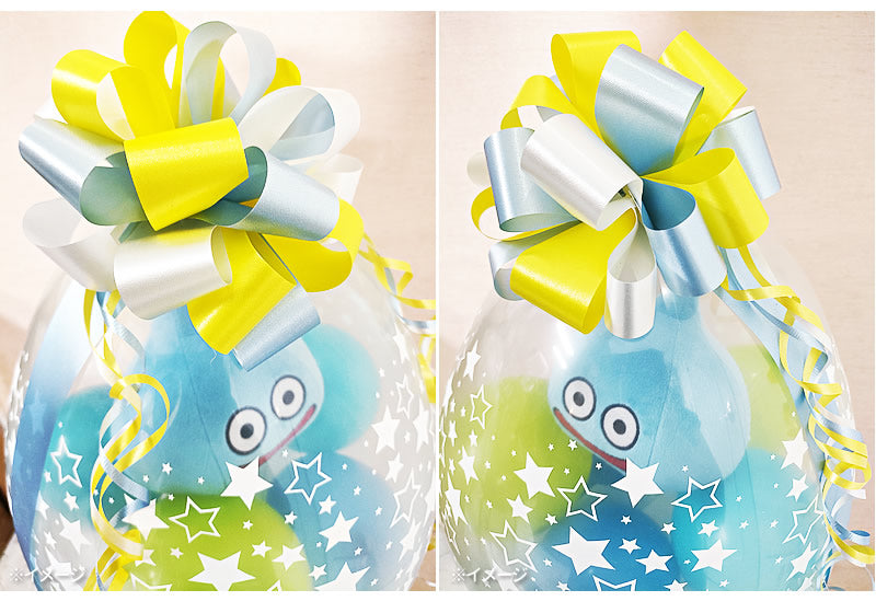 透明バルーンの中に「ドラゴンクエスト Mサイズぬいぐるみ」とブルー系のミニバルーンを閉じ込めた、華やかなぬいぐるみバルーンラッピングギフトです。
