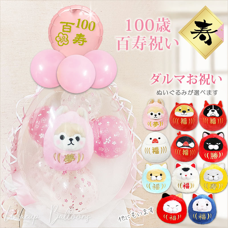 百歳 お祝い 百寿 紀寿 100歳 誕生日 贈り物 プレゼント 桃色 和風 ギフト 犬 猫 だるま 縁起物 バルーンギフト - ぬいぐるみバルーンラッピングギフト10インチ百寿&選べる福だるま<桜満開>