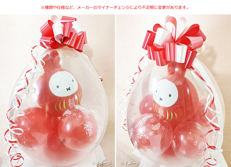 透明バルーンの中に、ミッフィーの「福だるま」ぬいぐるみと、和柄の赤い風船がコロコロっと入った特別仕様。