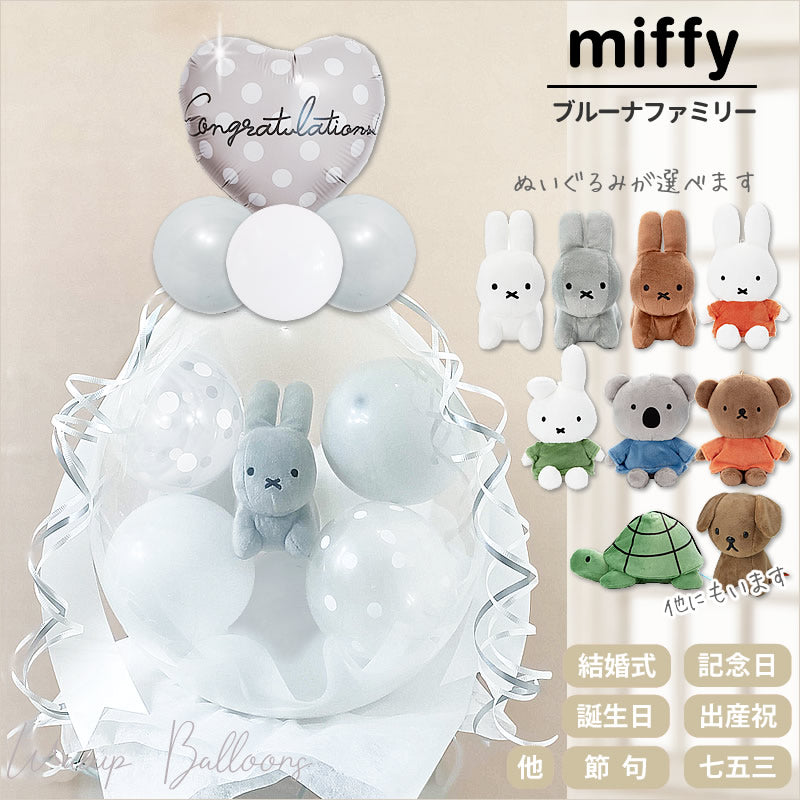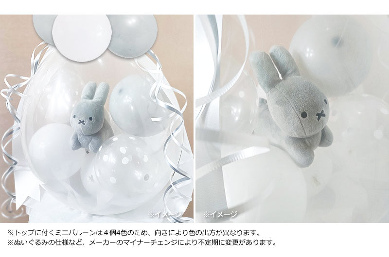 ミッフィーのぬいぐるみとくすみカラーの上品な風船が融合した、おしゃれでかわいいラッピングギフト。