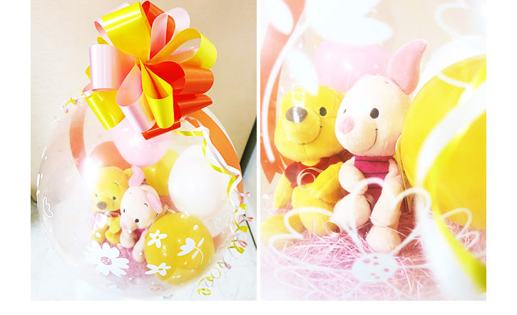 くまのプーさんと森の仲間たちのぬいぐるみを仲良く風船の中に入れてラッピング♪もう可愛くってキュンo(*^▽^*)o~♪