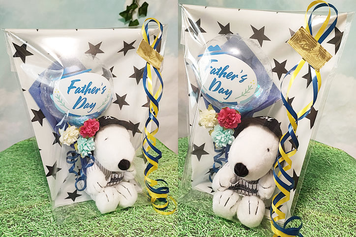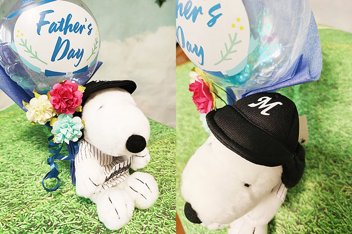 プロ野球12球団のロゴ入りタオルを掲げた“応援スタイル”のスヌーピーマスコットと、「父の日おめでとう」のメッセージが添えられた父の日限定ミニバルーンブーケをセットにした、野球好きなお父さんにぴったりのバルーンギフトです。